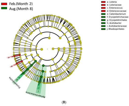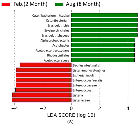 The bar graph (Figure 5A) and cladogram (Figure 5B) show the bacterial species that varied significantly between February (red) and August (green), as indicated by the LEfSe analysis. The genera Listeria and Enterococcus accounted for significantly larger proportions of the BTMM in February, and Catenibacterium and Acetobacter in August.