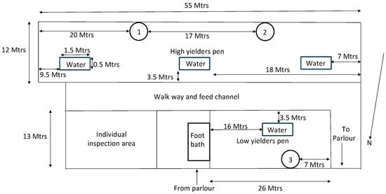 Loose-housing layout and brush position on the study farm. Included are the positions of the “Happy cow brush” mechanical brushes (numbered 1, 2 and 3). Brush 1 and 3 were inoperable at the time of investigation and therefore acted as static angled round brushes. Brush 2 was in full working order and would rotate when the cows interacted with it.