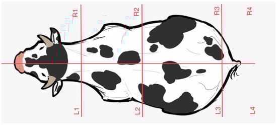 Cows were divided into eight areas to record the interaction with the brush. (Image adapted from Leon von Salisch, CC BY-SA 4.0 <https://creativecommons.org/licenses/by-sa/4.0>, via Wikimedia Commons accessed on 2 July 2024).