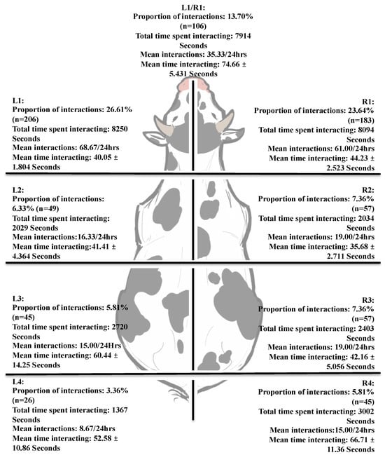 The sampled cows showed a tendency towards a difference for interacting with the brush with their front quarter (all results in area 1, n = 495) when compared to the rest of the body (n = 279) p = 0.0532, equating to a total time of 6 h, 44 min and 18 s (24,258 s) spent interacting with the brush front (head) on and only 3 h, 45 min and 55 s (13,555 s) interacting with the rest of their body. The interaction data (n = 774) across the 72 h was analysed further (Figure 3). Interaction time per area was compared via a Kruskal–Wallis test and found to have a high statistical significance (p = <0.0001). Post hoc analysis of this data using Dunn’s multiple comparison test showed a statistically significant increase in the time spent per interaction with L1/R1 when compared to L1, R1, L2, R2, L3 and R3 (p = <0.0001—p = 0.0203) (Table 3).