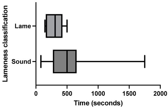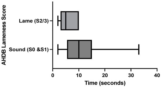 Total time spent brushing per individual (n = 48) separated by the lameness score (sound cows (n = 41) have an AHDB score of 0 or 1, lame cows (n = 7) have an AHDB score of 2 or 3 based on data from 22 February 2023).