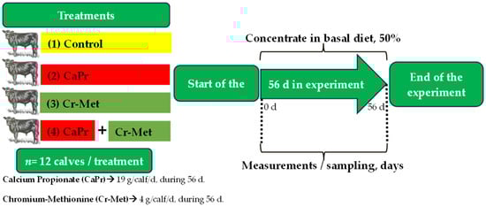 Dietary treatments were evaluated for 56 d (calf/d): (1) Control, no additives; (2) CaPr, 19 g CaPr; (3) Cr-Met, 4 g Cr-Met; and (4) CaPr + Cr-Met, 19 g CaPr + 4 g Cr-Met. The dose of CaPr was calculated based on the proportion of propionic acid of the product, taken as a reference from Rodríguez Cordero et al. [8] and Rivera-Villegas et al. [9], who used a dose of 20 g/calf/d of a product containing 69% propionic acid (69% × 20 g = 13.80 g propionic acid/calf/d). The product used in the present study (Propical® Dresen Química, SAPI de CV., Mexico City, Mexico) contained 73% propionic acid (73% × 19 g = 13.87 g propionic acid/calf/d); therefore, the dose was set at 19 g/calf/d. The supplemental Cr-Met source used was MiCroPlex® 1000 (Zinpro Corporation, Eden Prairie, MN, USA), containing Cr-Met 1000 ppm (Figure 1).