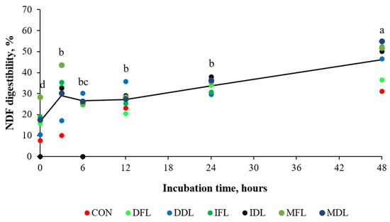 In vitro degradability of the substrate NDF as a function of the incubation time. CON = control treatment; DFL = decoction of fresh leaves; DDL = decoction of dry leaves; IFL = infusion of fresh leaves; IDL = infusion of dry leaves; MFL = maceration of fresh leaves; and MDL = maceration of dry leaves. Different letters represent significant differences in time (p < 0.05).