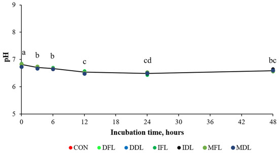 Ruminal pH values as a function of incubation time. CON = control treatment; DFL = decoction of fresh leaves; DDL = decoction of dry leaves; IFL = infusion of fresh leaves; IDL = infusion of dry leaves; MFL = maceration of fresh leaves; and MDL = maceration of dry leaves. Different letters represent significant differences in time (p < 0.05).