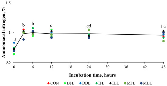 Ammoniacal nitrogen values as a function of incubation time. CON = control treatment; DFL = decoction of fresh leaves; DDL = decoction of dry leaves; IFL = infusion of fresh leaves; IDL = infusion of dry leaves; MFL = maceration of fresh leaves; and MDL = maceration of dry leaves. Different letters represent significant differences in time (p < 0.05).