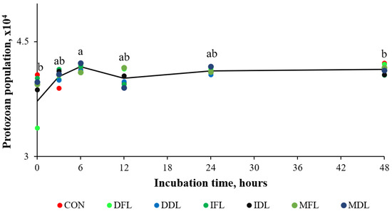 Protozoan population as a function of incubation time. CON = control treatment; DFL = decoction of fresh leaves; DDL = decoction of dry leaves; IFL = infusion of fresh leaves; IDL = infusion of dry leaves; MFL = maceration of fresh leaves; and MDL = maceration of dry leaves. Different letters represent significant differences in time (p < 0.05).