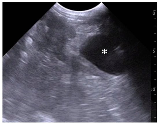 Ultrasonographic appearance of the uterus when scanning percutaneously. Anechoic fluid (asterisk) is seen within the enlarged uterine lumen. Scale = 10 mm.