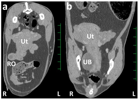 Transverse (a) and dorsal (b) contrast computed tomography images of the caudal abdomen. (a) The right uterine horn is shown as an enlarged, round structure, larger than that of the left uterine horn. The homogenously contrast-enhanced structure represents the enlarged uterus (Ut), wherein the uterine lumen is unclear. The contrast-enhanced ball-like structure of the right ovary (RO) includes a round cystic structure with weak contrast enhancement. (b) The uterus (Ut) is represented as the enlarged uterine cervix running along the urinary bladder (UB) within the pelvic cavity, and the uterine horns extend to the location approximately 4 cm cranially compared with the pelvis. Scale = 25 mm.