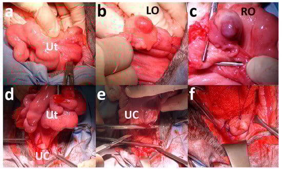 Images of the surgical procedure of ovariohysterectomy. (a) The multiple-beaded, extended uterus (Ut) is seen when pulled out from the abdominal cavity. (b) The left ovary (LO), approximately 1 cm in size, is located behind the left uterine horn. The corpus luteum is seen in the LO. (c) The right ovary (RO), approximately 2 cm in size, has follicular and luteal structures. (d) The severely thickened uterine cervix (UC) is seen when the uterus (Ut) is held out of the abdominal cavity. (e) An incision is made in the UC after its ligation. (f) The cut surface of the UC is closed with purse-string suturing.