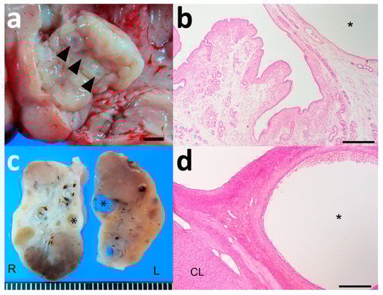 Surgically removed uterus and ovaries. (a) Swelling of the uterine mucosa and multiple cystic formations (arrowheads) are noted. Scale bar = 5 mm. (b) A cyst (asterisk) located in the endometrium is lined by a few layers of epithelial cells. The proliferation of stromal cells and marked edematous changes can be seen in the submucosa. Bar = 500 µm. (c) The cut surface of ovaries after formalin fixation. Both ovaries contain multiple corpus lutein (yellow to brownish nodules) and a few cystic structures (asterisks). Scale represents 1 mm intervals. (d) In the cortex of the ovary, a cyst (asterisk) is lined by granulosa cells and contains some cell debris. Bar = 500 µm.