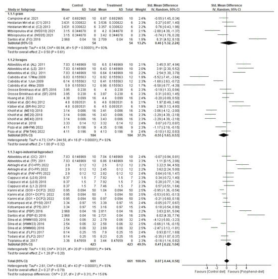 Nineteen research articles reporting 44 studies, were eligible to be included in the analysis to evaluate the effects of polyphenol supplementation on milk fat content. Subgroup analyses were conducted to see whether different sources of polyphenols affect the fat content in the milk. The different polyphenol sources were grain, forages and agro-industrial by-products, which constitute six, seventeen and twenty-one studies, respectively.