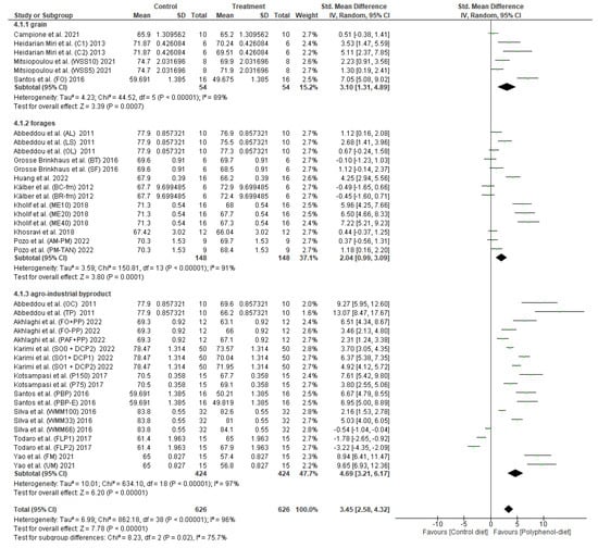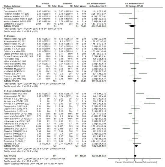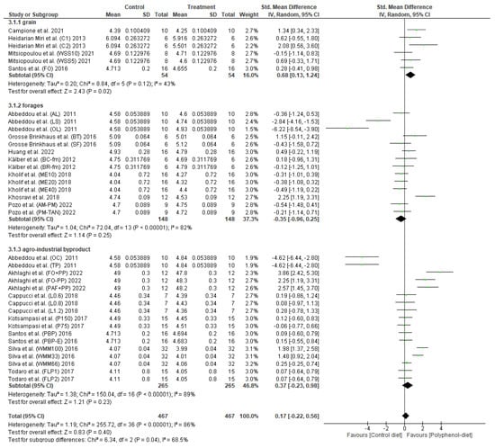 As depicted in Figure 2, the pooled SMD showed did cross the line of no effect, and thus it can be concluded that the overall effect is not significant statistically when supplemented with polyphenols in the diet (p > 0.05). Meanwhile, significant heterogeneity was observed for this outcome measure (p < 0.05) (I2 = 93%). Sub-group analysis was conducted to evaluate different sources of polyphenol supplementation (grain, forages, or agro-industrial by-products) effects on milk fat content. The analysis showed there are no significant differences (p > 0.05) in milk fat content between different sources of polyphenol supplementations with significantly lower heterogeneity (I2 = 15.6%).