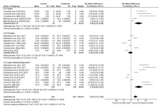 Figure 5 depicts the forest plots of the effect of three different sources of polyphenol on SFA content in milk. It was found that polyphenol supplementation significantly affects (p < 0.05) the saturated fatty acid content in milk with significantly high heterogeneity (p < 0.05) at I2 = 96%. In the analysis to evaluate different sources of polyphenol supplementations, it was also found that different polyphenol sources (grain, forages, or agro-industrial by-products) significantly affect (p < 0.05) the content of saturated fatty acid in milk with high heterogeneity at I2 = 75.7%. Results showed that there are significant differences (p < 0.05), with a heterogeneity of I2 = 89% in milk SFA content from grain source of polyphenol supplemented in the diet, and significant differences (p < 0.05) with a heterogeneity of I2 = 91% in milk SFA content from forages source of polyphenol supplemented diet. The polyphenol from agro-industrial by-product sources also showed a significant difference (p < 0.05) in milk SFA content at high heterogeneity of I2 = 97%.