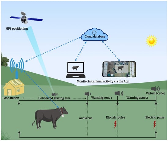 The operational mechanism of virtual fencing relies on the sophisticated integration of positioning technology and behavioral conditioning [20]. As the authors of [21] explain, these systems continuously monitor an animal’s position through GPS tracking, comparing it against predefined virtual boundaries established by farmers using digital mapping tools. When cattle approach these boundaries, the system initiates a two-stage deterrent process: first emitting an audible warning signal, followed by a mild electrical stimulus if the animal continues moving toward the boundary [22]. This design is rooted in operant conditioning principles, where animals learn to associate the initial auditory cue with the subsequent aversive stimulus [7].