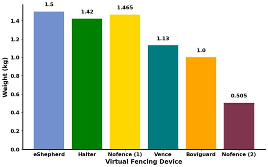 Weight of virtual fencing devices. Nofence® (1) for cattle; Nofence® (2) for sheep/goats. Adapted from Colusso et al. [48], Lomax et al. [49], and Fisher and Cornish [53].