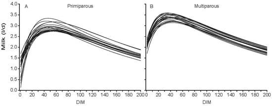 A random sample of 20 lactation curves for primiparous and multiparous ewes is presented in Figure 1 (Panel A and B, respectively).