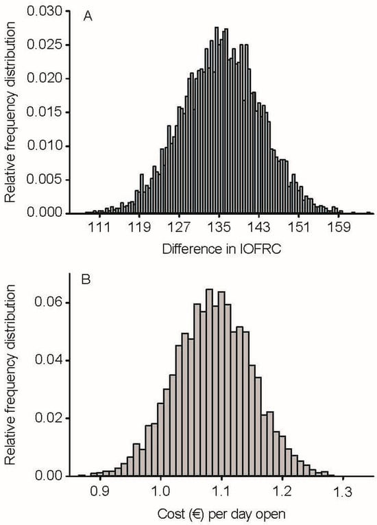 Although the IOFC and IOFRC per ewe were less when evaluated per lactation, both were greater for the 8-month LI compared to the 12-month LI when the evaluation was performed on an annual basis (Table 3). The mean difference in IOFC between ewes in the 8-month LI and those in the 12-month LI was EUR 135.2, with 95% of the scenarios between EUR 119.2 and EUR 151.1 (Figure 2, panel A). The minimum and maximum values of difference in IOFC between ewes in the 8-month LI and those in the 12-month LI was EUR 108.1 and EUR 164.8 (Figure 2, panel A). The mean cost per additional day open in the 12-month LI was EUR 1.08, with 95% of the scenarios between EUR 0.95 and EUR 1.21 (Figure 2, panel B). The minimum and maximum values per each additional day open was EUR 0.86 and EUR 1.33 (Figure 2, panel B).