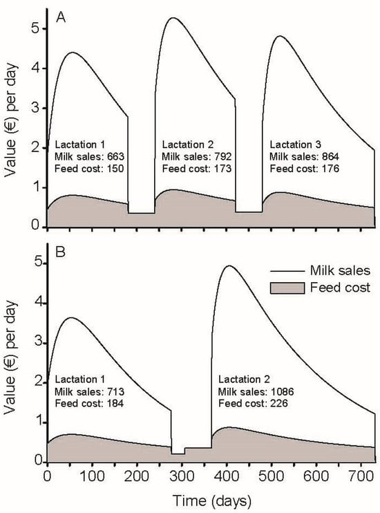 Figure 3 shows the milk sales and feed cost per day for an ewe sampled from the 8-month LI group (panel A) and an ewe sampled from the 12-month LI group (panel B). These ewes were chosen based on their productive life of 731 days in the flock after the first lambing. Lifetime milk sales and lifetime feed cost after the first lambing were EUR 2319 and EUR 499 for the ewe in the 8-month LI, and EUR 1799 and EUR 410 for the ewe in the 12-month LI.