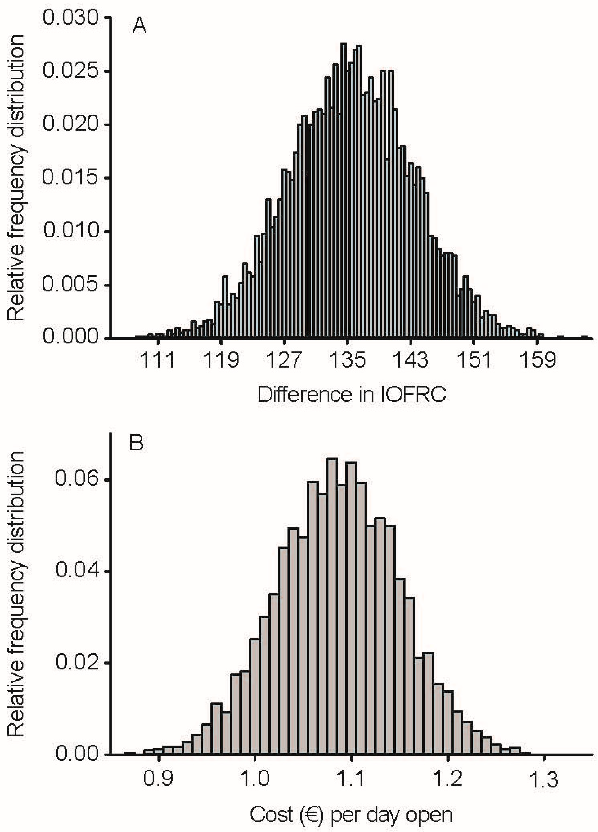 Figure 2. Relative frequency distribution for difference in income over feed and replacement cost (IOFRC, panel (A)) and cost per additional day open (panel (B)) for Lacaune ewes submitted to a reproductive management program to target 8-month lambing interval (LI) or 12-month LI by varying the voluntary waiting period. IOFRC—income over feed and replacement cost. The IOFRC was calculated by subtracting the cost of feeding and the replacement cost from the sales of milk, lambs, and culled ewes. The cost of each additional day open was calculated by dividing the difference in IOFRC by the difference in days open between the 2 groups. Stochastic simulations were run and recorded for 5000 iterations. Monthly milk production records from 700 ewes housed in 3 commercial farms near Thessaloniki, Greece, were used to fit and model farm-observed lactation curves. Parameter estimates (mean ± SD) were obtained by fitting the Milkbot model. Nutritional requirements were determined following the guidelines of the INRA [20]. All prices used were in effect in the market during the time period of 2024/2025 in which this study was performed.