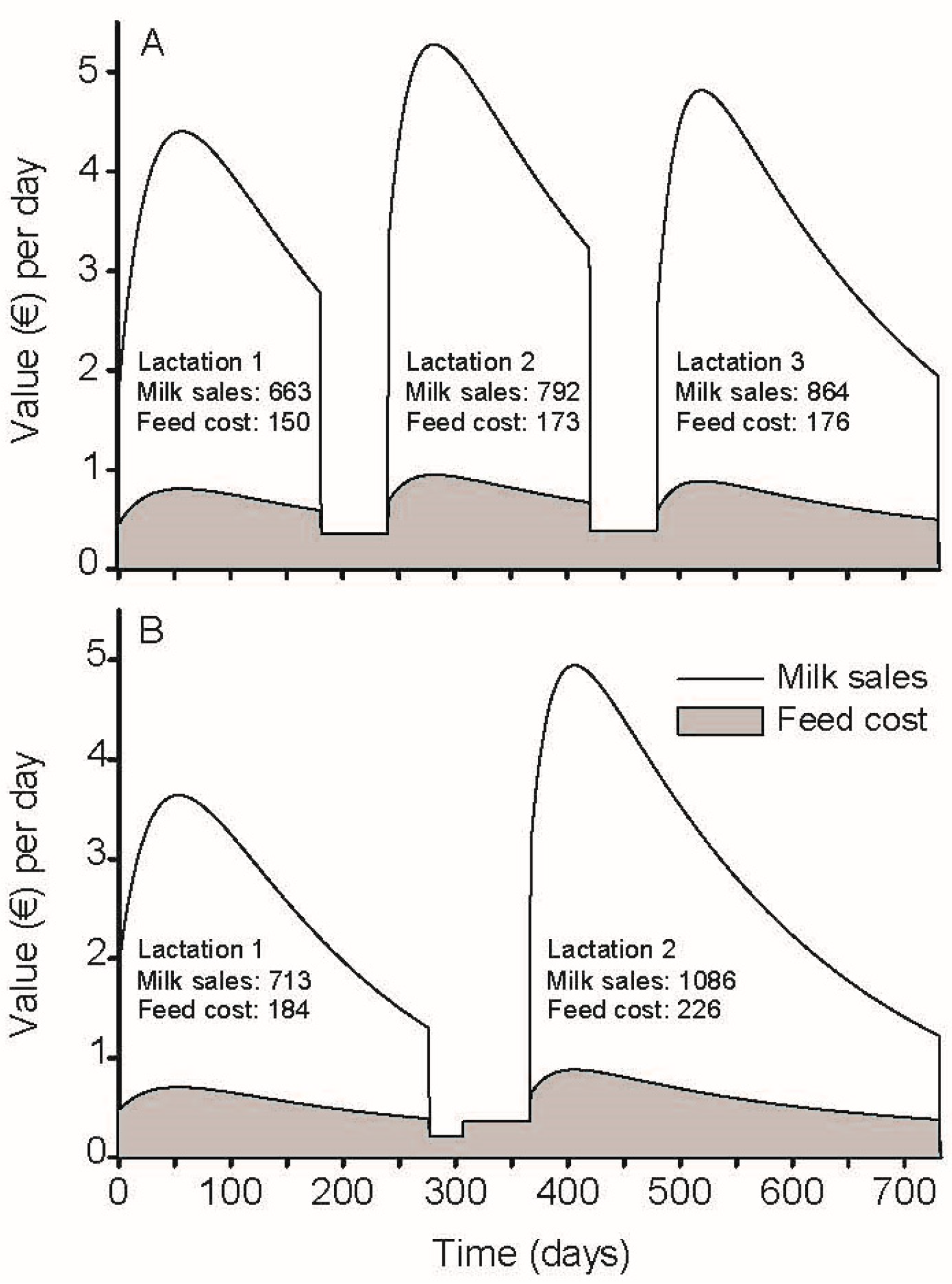 Figure 3. Milk sales and feed cost for one ewe in the group of 8-month lambing interval (LI, panel (A)) and one ewe in the 12-month LI (panel (B)). Ewes were chosen based on the same productive life of 731 days after first lambing. Monthly milk production records from 700 ewes housed in 3 commercial farms near Thessaloniki, Greece, were used to fit and model farm-observed lactation curves. Parameter estimates (mean ± SD) were obtained by fitting the Milkbot model. Nutritional requirements were determined following the guidelines of the INRA [20]. All prices used were in effect in the market during the time period of 2024/2025 in which this study was performed.