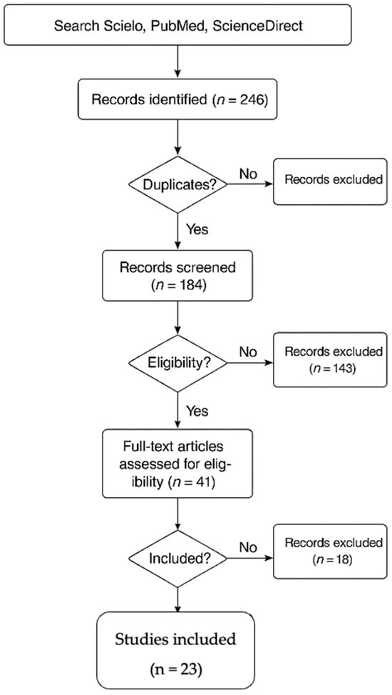 The selection process was conducted in three consecutive phases: Identification: Initial screening based on titles and keywords retrieved from the databases. Screening: Abstracts were evaluated to determine alignment with the review objectives. Eligibility and Inclusion: Full texts were read and assessed against all inclusion and exclusion criteria. From an initial pool of 246 studies (76 from SciELO, six from PubMed, and 164 from ScienceDirect), 23 manuscripts fulfilled all eligibility criteria and were retained for in-depth analysis.