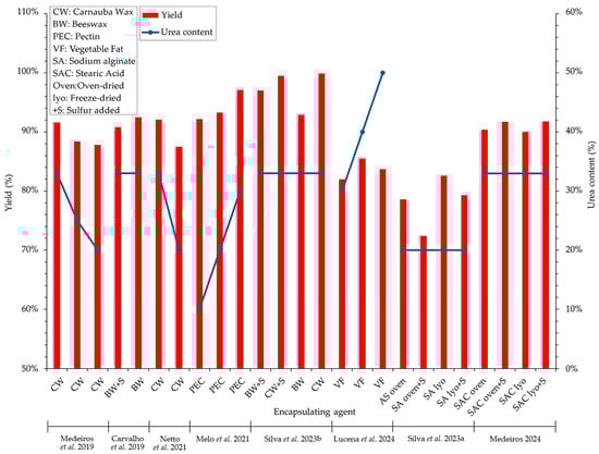 63. Medeiros, T.T.B.; Silva, A.M.A.; Silva, A.L.; Bezerra, L.R.; Agostini, D.L.S.; Oliveira, D.L.V.; Mazzetto, S.E.; Kotzebue, L.R.V.; Oliveira, J.R.; Souto, G.S.B.; et al. Carnauba wax as a wall material for urea microencapsulation. J. Sci. Food Agric. 2019, 99, 1078–1087. [Google Scholar] [CrossRef]