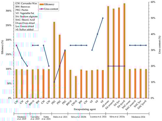 According to Carvalho et al. [52], bee wax micrographs show a slightly irregular, intact, sealed, non-porous, and smooth surface, which contrasts with the more irregular morphology of carnauba wax [63]. In the case of SRU encapsulated with beeswax, the surface appeared very similar to that of isolated bee wax, indicating that urea was located inside the microparticle, although minor surface exposure was detected. However, Carvalho et al. [52] further observed that when sulfur was incorporated into the bee wax encapsulant, the microstructure became clearly rough and aggregated, suggesting a significant presence of exposed urea. This effect was likely associated with the sulfur source, which reduced the protective efficiency of the matrix and led to nitrogen exposure.