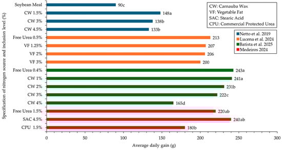 72. Lucena, K.H.D.O.; Mazza, P.H.; Oliveira, R.L.; Barbosa, A.M.; Perreira Filho, J.M.; Bessa, R.J.; Alves, S.P.; Edvan, R.L.; Pereira, E.S.; Fonseca, M.; et al. Slow-releasing urea coated with low-trans vegetable lipids: Effects on lamb performance, nutrient digestibility, nitrogen balance, and blood parameters. Anim. Feed Sci. Technol. 2024, 310, 115925. [Google Scholar] [CrossRef]