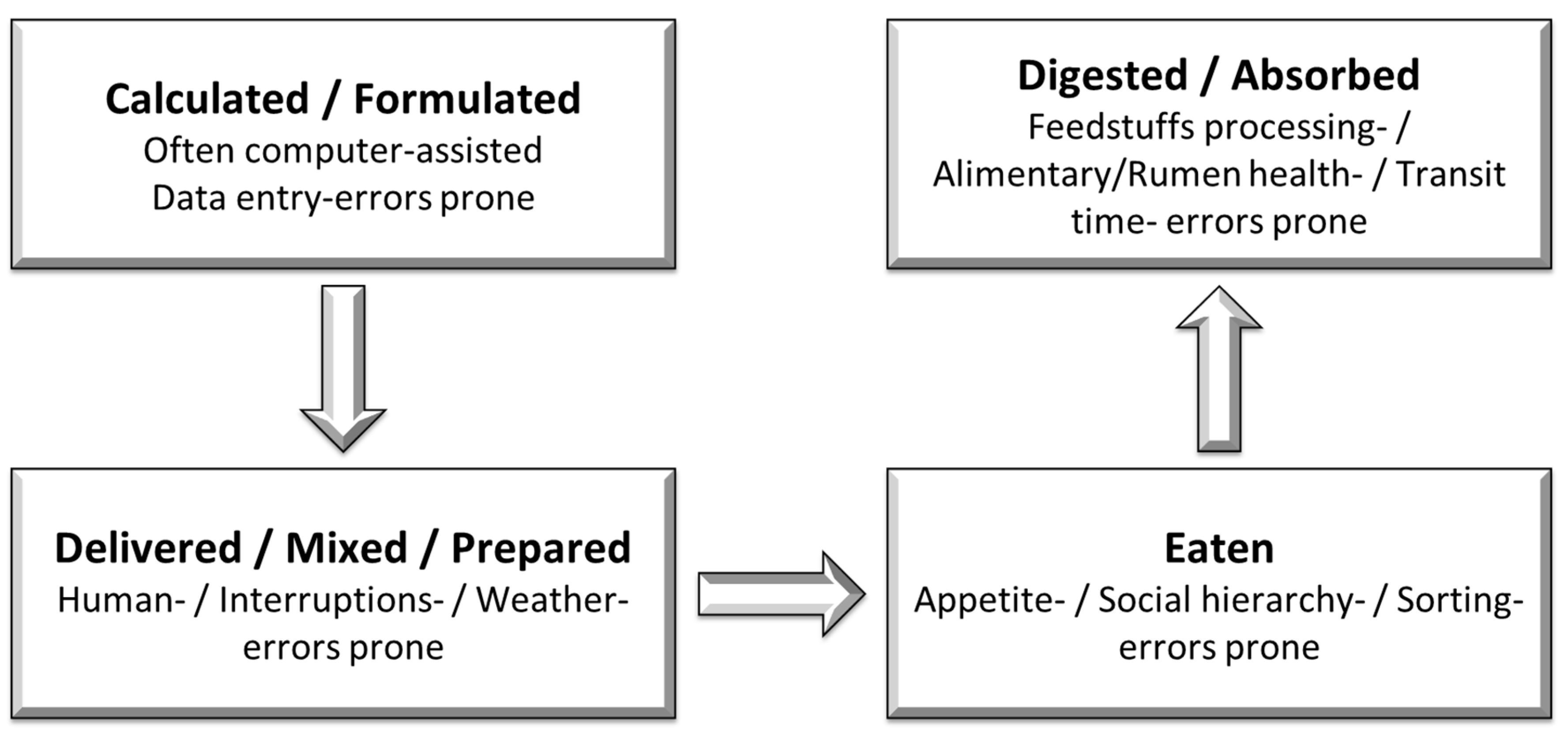 - Examine possible wrong data about the composition of feedstuffs (e.g., assumptions of feedstuff composition, improper sampling technique, new batch delivered, or relying on published tables).