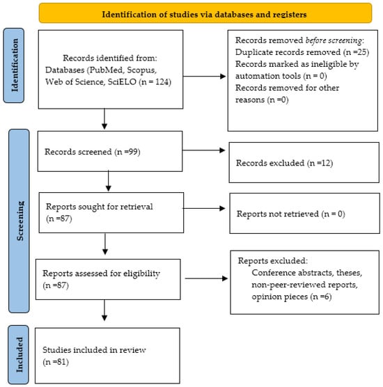 PRISMA flow diagram summarizing the screening and selection process of studies included in this systematic narrative review. From 124 records initially identified, 99 remained after duplicate removal, 87 were assessed for full-text eligibility, and 81 were included in the final synthesis.