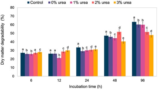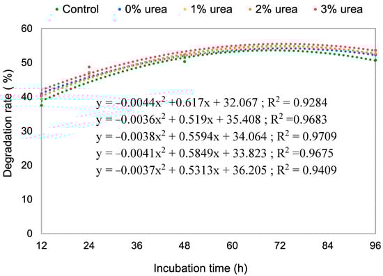 Dry matter degradability rate of silages with different levels of urea over 96 h of incubation.