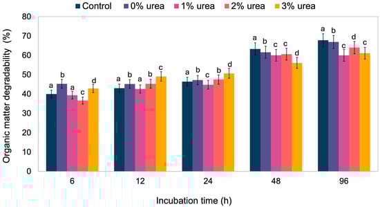 The results for OM degradability over time and under varying levels of urea are shown in Figure 2 and Table S3. By the final incubation period, the silage treated with 2% urea outperformed those with 1% and 3% urea. Furthermore, as shown in Figure 3, the degradability rate increased with incubation time for all urea levels until stabilizing at 72 h.