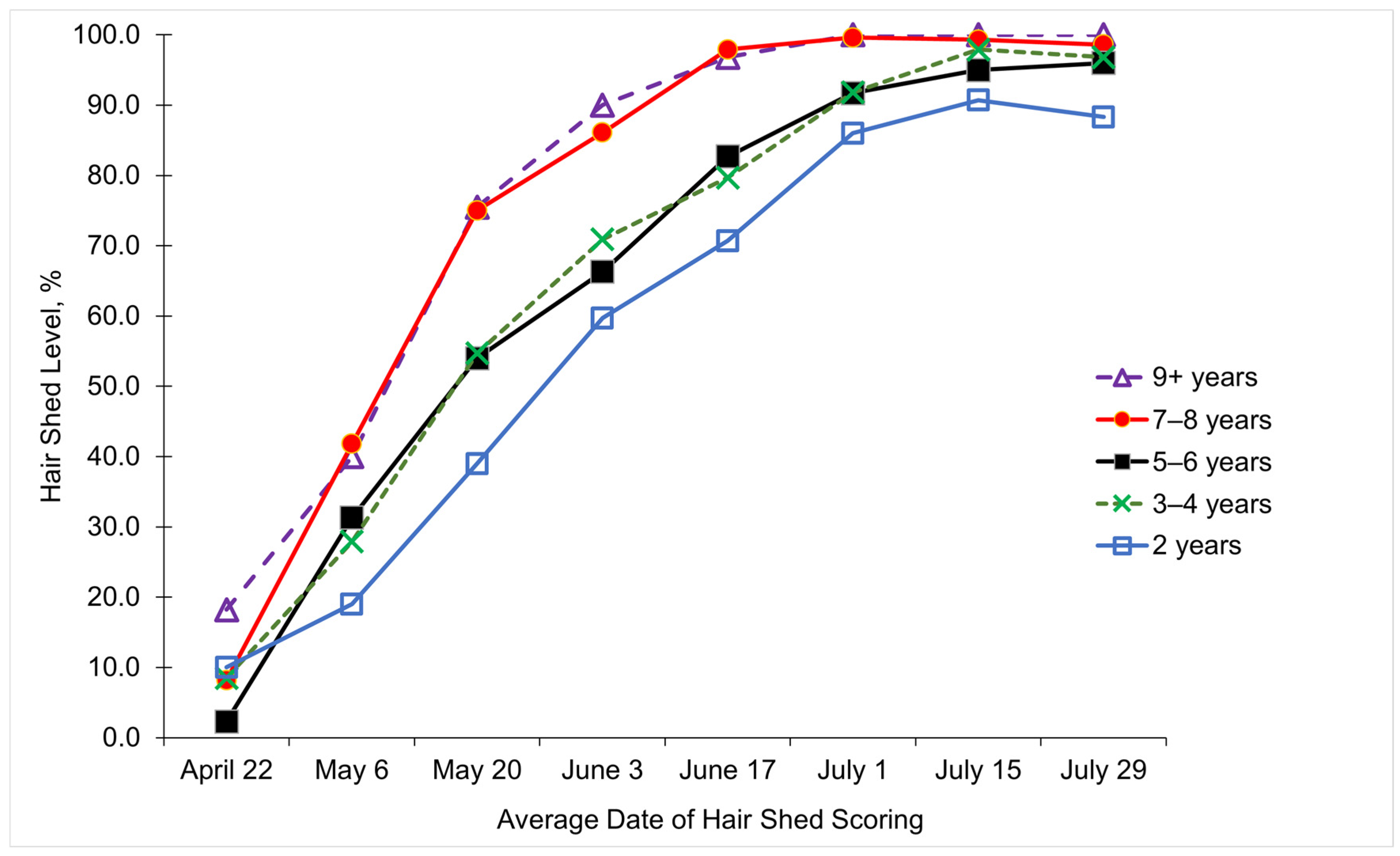 - Foster, M.M.; Powell, J.G.; Kegley, E.B.; Kutz, B.R.; Backes, E.A.; Meyer, L.R.; Shoulders, B.P.; Anschutz, K.S. Effect of hair coat shedding on herd performance in crossbred beef cattle. J. Anim. Sci. 2016, 94, 5. [Google Scholar] [CrossRef]