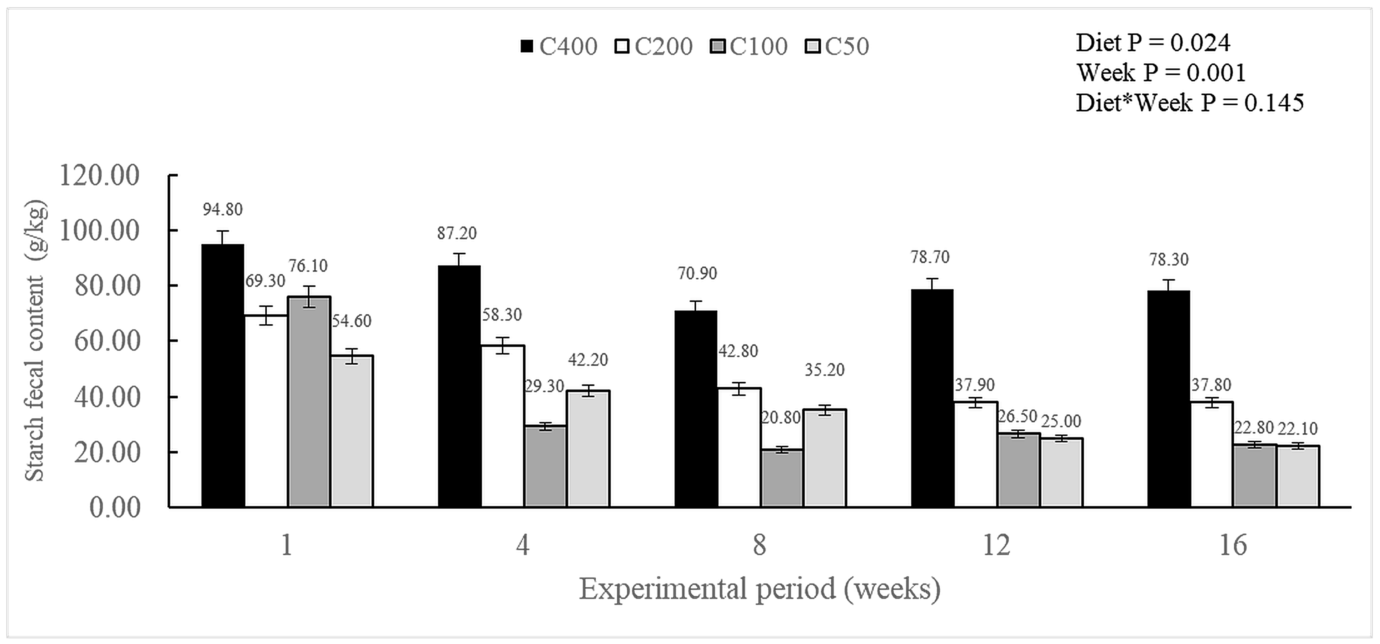 Fecal starch values unequivocally indicate that the greater amounts of corn included in the diet of the cattle (especially in the C400 group) led to higher starch excretion over the entire experimental period. The continuously higher fecal starch content in C400, even after 16 weeks, seems to reflect a digestive constraint in the handling of such high starch supplementation. Insufficient time is available for the rumen microbiota to ferment the amount of starch that is consumed. This may decrease enzymatic digestion of the food in the small intestine and increase nutrient excretion through feces.