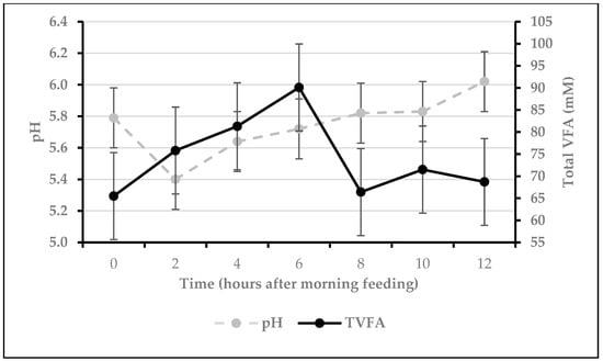Changes in pH and total VFA of fermenter contents of all treatments (combined) before (0 h) and every two hours after the a.m. feeding on d 10. Bars indicate SEM.