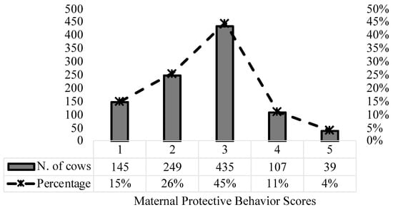 None of the 975 evaluated cows were scored as 6 for MPB, showing that the reaction of running around the pen and trying to escape was not expressed. In addition, no calf was abandoned (MPB = 7) by its mother during the evaluation period. Therefore, these scores were not considered in the statistical analyses. It was observed that the majority of Nellore cows (45%) remained calm, attentive, and close to the calf during the handling procedure, not being aggressive towards the cowhands. However, considering that 4% of the cows reacted aggressively towards the cowhands during the handling procedure, it is imperative to handle them carefully to avoid animal welfare-related issues and/or labor accidents (Figure 1).