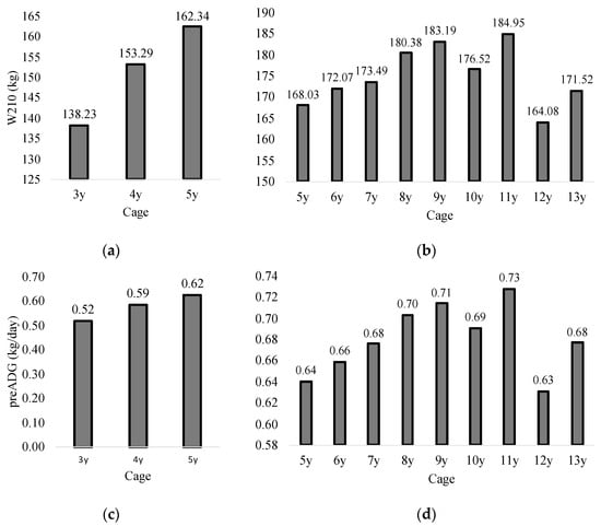 Adjusted means of weight adjusted for 210 days (W210, kg) of age and pre-weaning average daily gain (preADG, kd/day) as a function of the cow age classes (Cage) for each production unit, in which U2 = (a) and (c), respectively, and U4 = (b) and (d), respectively.