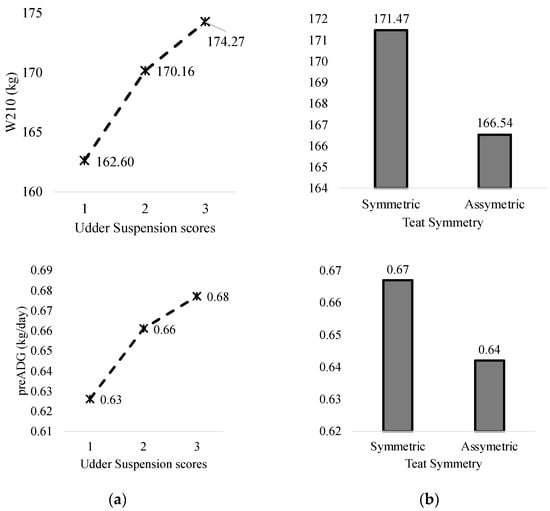 Regarding udder suspension, it is important to highlight that cows with poor udder quality and those with udder problems are normally culled []. Thus, among all assessed cows, US equal to 4 and 5 were not observed. Even so, a significant effect of US on W210 and preADG was observed and the larger the US, the greater the calves’ W210 and preADG (Figure 3a). Most cows showed symmetrical teats (n = 691), and their calves had higher preADG and consequently higher W210 when compared to those showing asymmetrical teats (Figure 3b).
