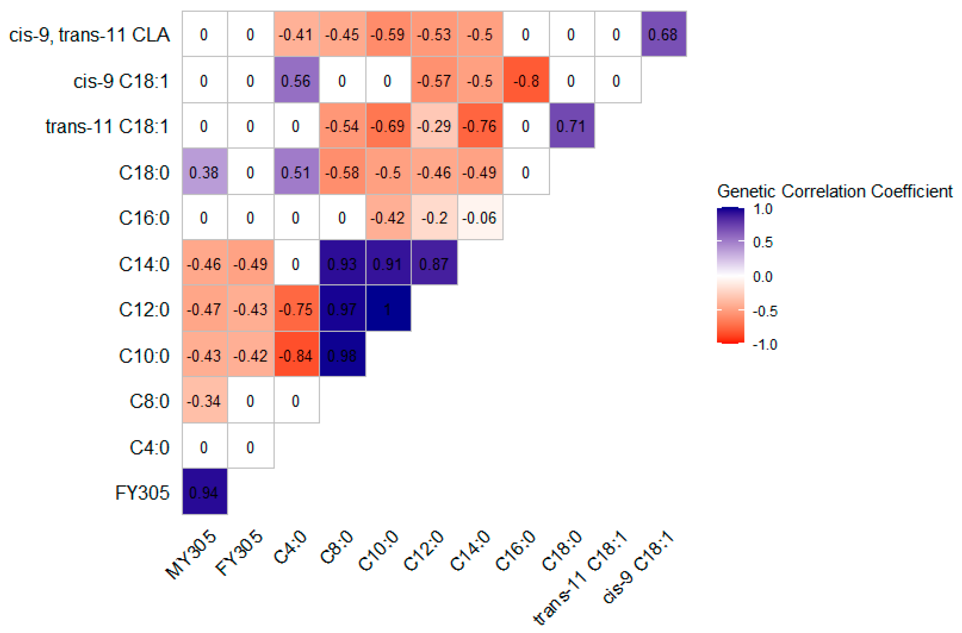 - Soyeurt, H.A.; Gilson, A.; Vanderick, S.; Mayeres, P.; Bertozzi, C.; Gengler, N. Estimation of heritability and genetic correlations for the major fatty acids in bovine milk. J. Dairy Sci. 2007, 90, 4435–4442. [Google Scholar] [CrossRef]