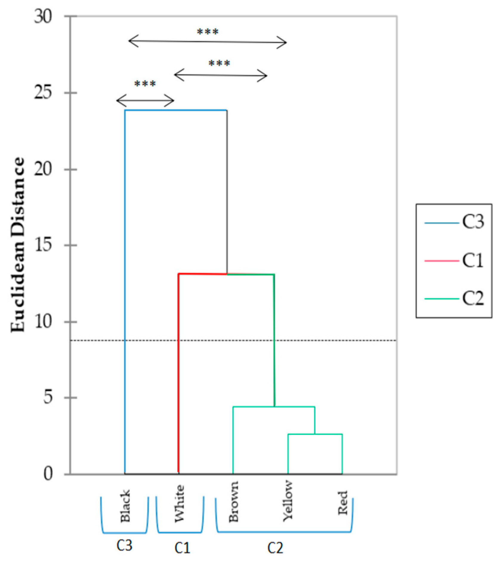 3.2. Variation in Hair Cortisol in Relation to Hair Color