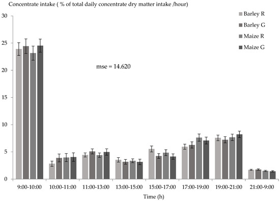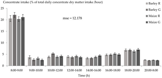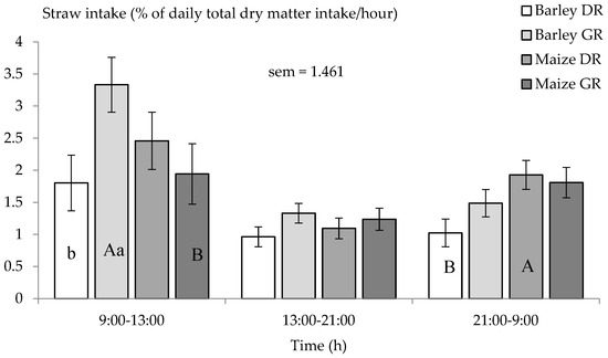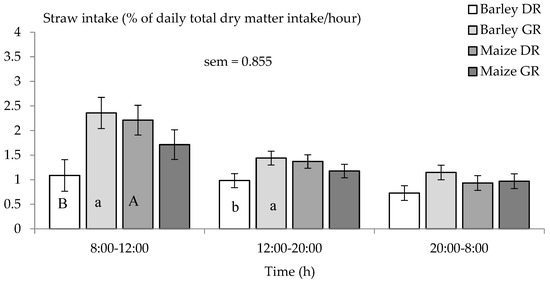 p < 0.05) for concentrate daily intake. As a result, animals consuming ground barley ate less concentrate than those fed rolled barley, whereas there were no differences between processing methods for animals fed maize-based diets. Animals consuming ground-barley concentrates consumed significantly more straw than those fed on dry-rolled-barley concentrates (