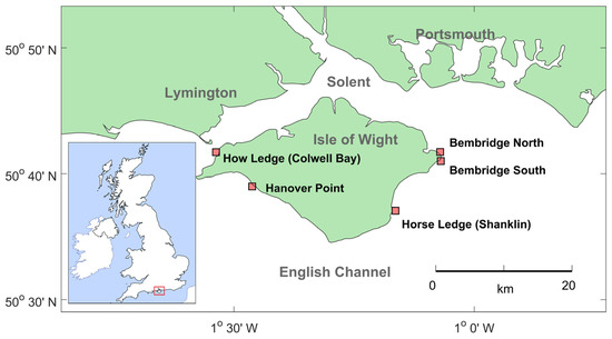 The Isle of Wight on the south coast of England (Figure 1) has five of the largest enclaves of Padina pavonica remaining in the British Isles and these are located at sites with varied wave exposure and substratum [37,47]. These populations have been known for over a century and herbarium material has been deposited in the Natural History Museum (London) [36,47]. To date, species identification has been based only on morphological characteristics, yet with ongoing research into the genus, it is possible that taxonomy of English populations and others on the North-East Atlantic will be revised [35]. Padina on the south coast of England are usually attached to the bottom and sides of rock pools, normally in the middle and lower shore zones. The regional hydrodynamics of this coast are complex [48,49]. The tidal range in the west of the Solent is between 2 and 3 m, and this increases to 4 m in the east. There are strong west–east tidal streams (max 3 ms−1) and the water is well mixed. The region also experiences a double stand at high water on spring tides and a gyre is located offshore in the east of the Isle of Wight [17]. Prevailing wind direction is south-west, so the enclaves of P. pavonica are on exposed or moderately exposed shores. Mean salinity at Padina enclaves is 34‰ and sea temperature range is 6–19 °C. The Solent region has a considerable urban population and infrastructure, and pollution and other disturbances pose a risk to remaining enclaves of Padina.