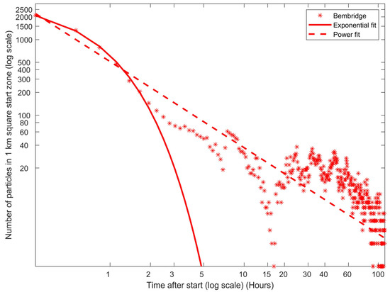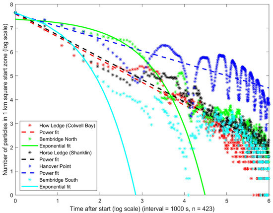 Number of particles in start zone against time since release. Time step = 1000 s, over 5 days. Power or exponential fit chosen by maximum likelihood. A total of 2500 released randomly over 8 h period starting at spring high tide (therefore time data here not concurrent with actual time but different start for each particle). The tidal pattern in all groups is most evident in the particles released at Hanover Point. Since the coastline at this location is comparatively more geographically linear than the other sites, some particles are retained in a higher-density group and thus a higher proportion of these return to the start zone, with each tide, in a more coordinated pattern. This effect is consistent with the patterns which can be compared between the sites in the other figures. The fits to power law or exponential function relate to general theories of dispersal discussed in the text.