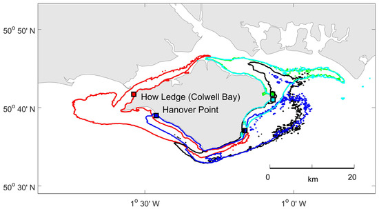 Hydrodynamic conditions in the study area (Figure 1) were simulated using the two-dimensional (2D), depth-averaged flow model TELEMAC-2D (http://www.opentelemac.org/, accessed on 10 June 2021). We used an existing 2D hydrodynamic model that was built for planning and other commercial purposes by HR Wallingford Ltd. (Wallingford, UK). The water model was built to well-established engineering tolerances and had been calibrated using a variety of existing and newly surveyed bathymetric and flow data (see ref. [31] and references therein for an explanation of the type of water model and its application). The spatial resolution of the unstructured triangular mesh used by the model is variable between 100 and 2000 m. The water model was run ‘off-line’ for a full spring–neap tidal cycle and the velocity and depth results at 1400 s time steps were saved. This is an appropriate increment for saving the output of a tidal hydrodynamic model; it is an arbitrary choice but has been shown to capture all the essential dynamic features of a tidal cycle, and this can be checked directly during operation of the water model, which typically uses a 1 s internal time step [31]. In order to allow the hydrodynamic model results to be used over any period of time, starting at any point in the tidal cycle, the results file data were looped using the following method. An arbitrary start time (after the model had stabilised (run-in) was chosen, and then the hydrodynamic model output was run through the entire spring–neap cycle while depths were interpolated from the data in space and time and recorded at set of three reference points. The reference points were chosen arbitrarily to represent positions across the entire model area and an end time was chosen when the tide had returned as close as possible to a similar state at all three sites simultaneously. By referencing (connecting) the data at the end time back to the start time, the hydrodynamic data could be looped continually through endless similar spring–neap cycles. This method is computationally efficient in comparison to running a particle model at the same time as the water model and is functionally identical.