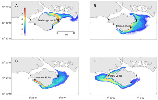 In order to represent the dispersion of the modelled particles as a surface rather than a series of discrete points we summed their positions across a square spatial grid. It is important not to limit the results to a single time, because the tidal cycle means that particles repeatedly cover a range of space, so the results are visualised by using all the positions of the particles over an extended time period—in this case, we used the entire 5 day run of the model. When all the positions are allocated to similar area grid spaces, the resultant numbers represent a probability that any particle would be found in that grid space at any time during the modelled period. Thus, when normalised, the surface is formally a probability density kernel representing the probability of dispersion to each grid square. The individual probabilities across the grid are arbitrarily scaled by the granularity of the grid and are usually very small values, but this is irrelevant as long as the results are compared over a similar probability grid. We have found that, in visualisation, a log transformation of the results makes comparisons more meaningful as areas with very small probability values are enhanced in comparison to higher-density areas. Thus, the geographic figures scale probabilities in log-transformed values to display the probability density kernels.