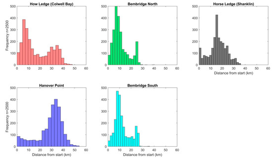 Histograms of distance away frequency for n = 2500 particles on final step after 5 days at liberty. Some model boundary edge interaction is evident in Bembridge N and S. Note that Hanover Point shows least number of spores closest to source. (The colours of the histograms are consistent with those used in Figure 2, Figure 3, Figure 4 and Figure 5 for the different sites.)