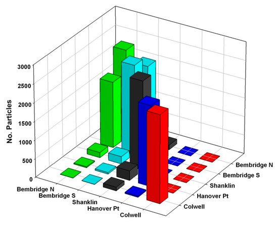 The histograms of Colwell Bay especially and the Bembridge sites to a lesser degree show a bimodal pattern which is consistent with their positions on the extreme east and west of the island (Figure 7). The dominant tidal excursion at this overall location is east–west and so these positions on the headlands allow particles to travel both to either the north and south of the island, or away from the coast, in which areas dispersions are markedly different, whereas the other two sites are both on the more exposed and geographically linear southern shores and so their dispersion is overall further and more unimodal, with Hanover point being the extreme of this pattern. Note that Hanover Point shows least number of spores eventually retained closest to source which is a contrast to the pattern in Figure 3. This is explained by the retention of a group of particles in a linear pattern near Hanover Point. A high proportion of this minority are drawn back into the start zone at each tidal cycle, which again is consistent with the location of other sites where, in contrast, local dispersion near the release zones was more diffuse.
