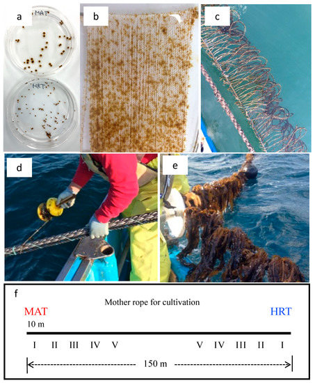 Photographs and a schematic diagram of the cultivation tests. (a) Gametophytes from regional strains of Undaria pinnatifida; (b) sporelings attached to fibers wound around a stainless steel frame; (c) the acclimatization of the sporelings to marine conditions at the marine cultivation farm; (d) setting the sporelings on the mother cultivation rope; (e) collected thalli from 1m of the mother rope to measure the yield and morphological characteristics; and (f) diagram of the 150-m-long mother rope and the setting of MAT and HRT, which were cultivated from each end of the mother rope. I–V indicate the dates on which the sporelings were set and the cultivation began. These were as follows: set I, 14 September; set II, 9 October; set III, 19 October; set IV, 6 November; and set V, 12 December.