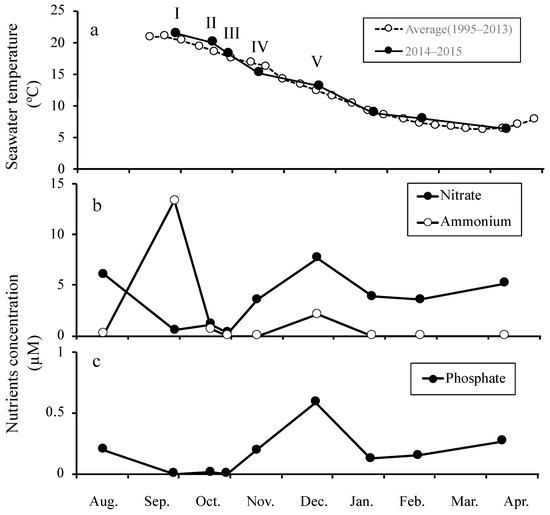 Changes in the environmental conditions and nutrient concentrations at Hirota Bay. (a) Seawater temperature, (b) nitrate (NO3–N) and ammonium (NH4–N) concentrations, and (c) phosphate (PO4–P) concentration. I–V indicate the dates on which the sporelings were set and cultivation began (see Materials and Methods).