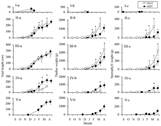 Changes in the total length (a), the thallus weight (b), and the sporophyll weight (c) of Undaria pinnatifida of MAT and HRT at five different dates on which the sporelings were set and cultivation began (set I–V, see Section 2, shows as I–V). The values represent the mean ± standard deviations (n = 20 individuals). The asterisks indicate significant differences between MAT and HRT at p < 0.05 according to a t-test.
